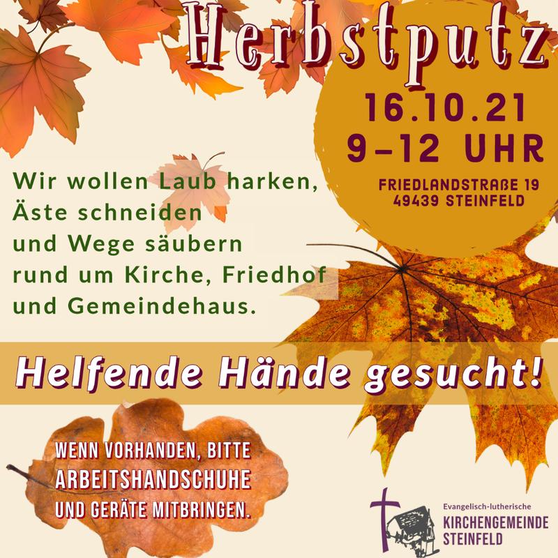 Wir suchen helfende Hände, die am Samstag, den 16.10.21, mitanpacken. Wir wollen auf dem Gelände um Kirche, Friedhof und Gemeindehaus Wege säubern, Äste schneiden, Laub harken und vieles mehr.